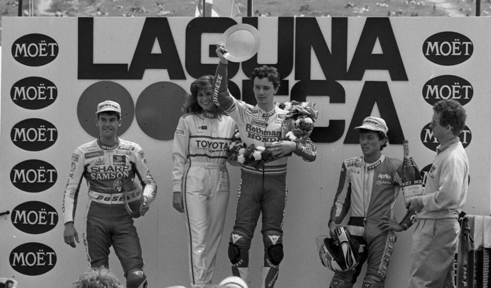 In this week’s Throwback we dial back the time machine 28 years to 1991 and the U.S. Grand Prix at Laguna Seca. This photo shows the podium finishers in the 250cc Grand Prix race, with Luca Cadalora standing atop the rostrum after winning aboard his Rothmans-Kanemoto Honda. Flanking Cadalora are Wilco Zeelenberg (left) who finished second and third-place Loris Reggiani (right).