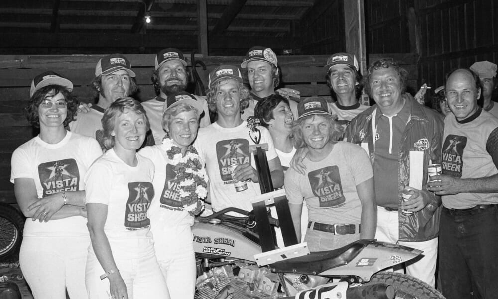Springsteen’s sponsor at the time was Vista-Sheen, a t-shirt company based in Farmington, Michigan. As you can tell from this photo taken by then Cycle News East editor Gary Van Voorhis, the Vista-Sheen crew were very happy that night.