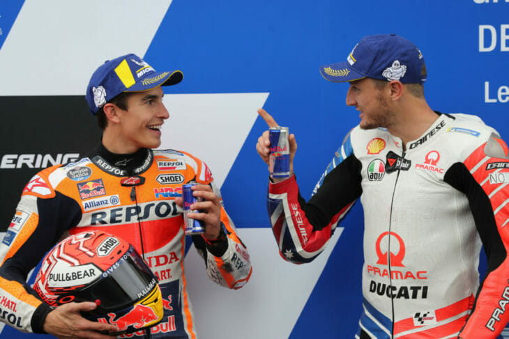 But while he was dominant in the latter half of the race, he didn’t have it all his own way. In the early laps, he was pushed back into second by on-form satellite-team Ducati rider Jack Miller, who had also started from the front row of the grid.