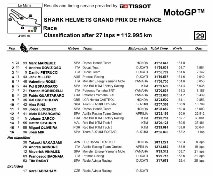 He had gradually outpaced satellite Petronas Yamaha rider Franco Morbidelli; but it was the second Petronas rider who rewarded the home crowd with an excellent ride. A bad first lap left new fast Frenchman Fabio Quartararo down in 15th, but he set fastest lap of the race as he forged through to an eventual eighth.