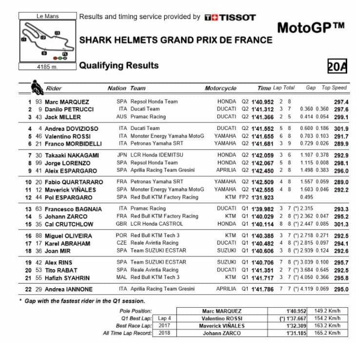 Wacky Le Mans weather made for exciting qualifying … but with no surprise about the name at the top. Repsol Honda rider Marc Marquez took a third pole in five races.