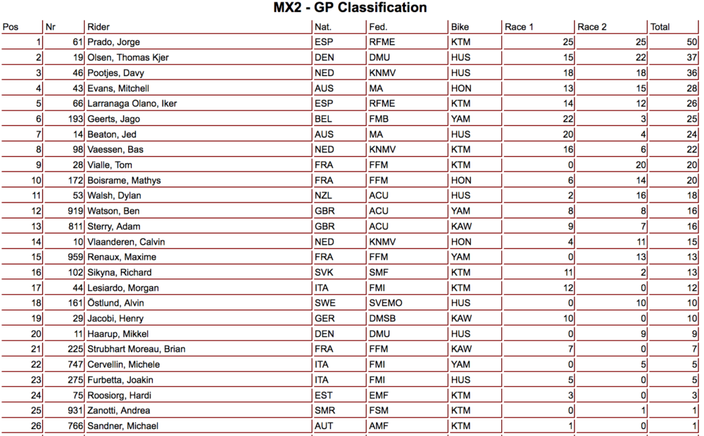 With his two-moto sweep in Mantova, Prado has now won all eight motos in which he has competed, but trails Olsen in the championship by 7 points due to Prado’s absence at the Grand Prix of Great Britain, which Prado missed due to a shoulder injury.