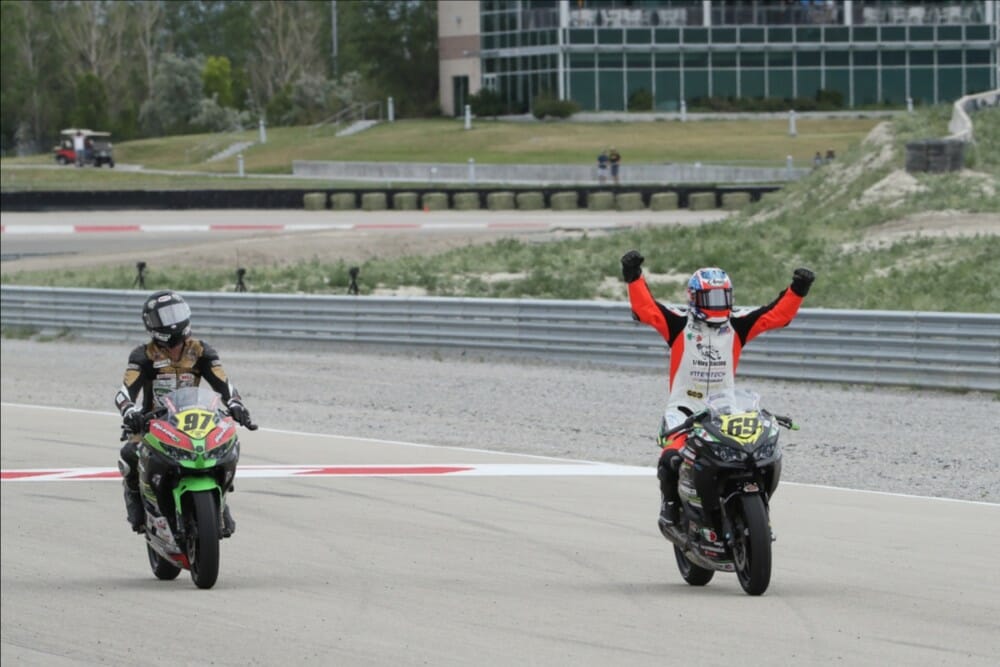 Ninja400R.com/Norton Motorsports/Dr. Farr’s Rocco Landers won his sixth race in seven starts in the Liqui Moly Junior Cup race on Saturday at UMC, the Oregonian fighting through from a poor start to beat Quarterley Racing/On Track Development’s Dallas Daniels by just .142 of a second.