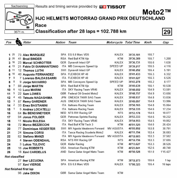 Xavi Vierge (EG VDS Kalex) had been in the mix up front but crashed out after a collision with erstwhile championship leader Thomas Luthi (Dynavolt Kalex). The Swiss rider was hit with a “long lap” penalty, and rejoined fifth behind Fabio di Giannantonio (Speed Up).