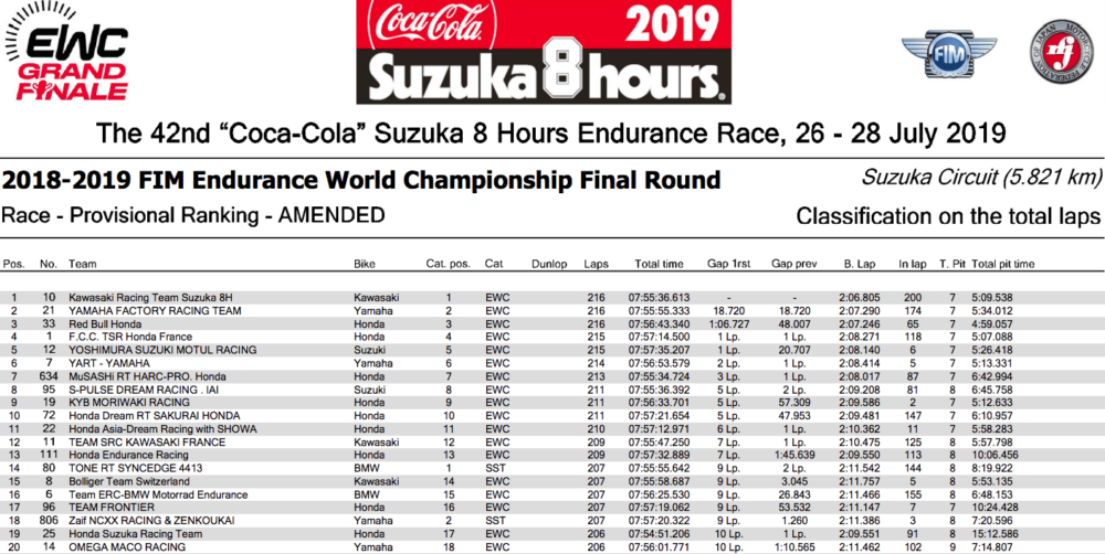 With champions-elect SERT failing to finish, the confusion over the race winners did not affect the outcome of the world championship, with Team SRC Kawasaki France (Jérémy Guarnoni, David Checa and Erwan Nigon) being crowned the 2019 Endurance World Champions.