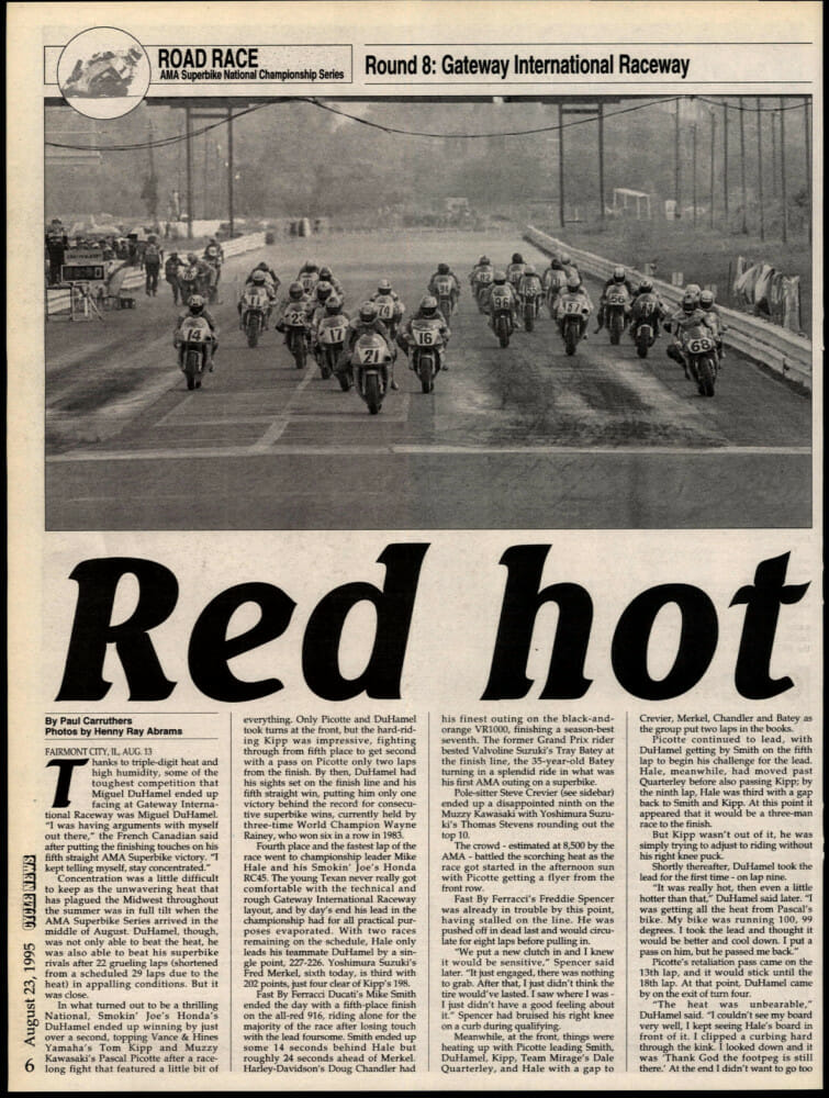 Ask anyone about the 1995 AMA Superbike event at Gateway International Raceway and the first thing they’ll say is, “It was hot!” The ’95 race, held at Gateway, which was just across the Mississippi River from St. Louis, proved to be the one and only AMA National Road Race ever hosted by the track. In spite of tremendous pre-race area publicity, radio and TV ads and promotion by St. Louis area dealerships, when race weekend came, very few fans showed up. The problem was an oppressive heatwave that hit the area. The race weekend was held in near triple-digit heat and high humidity. Not only did it make it difficult at best, for fans to try to enjoy the racing, but riders and tires had a tough time dealing with the heat as well.