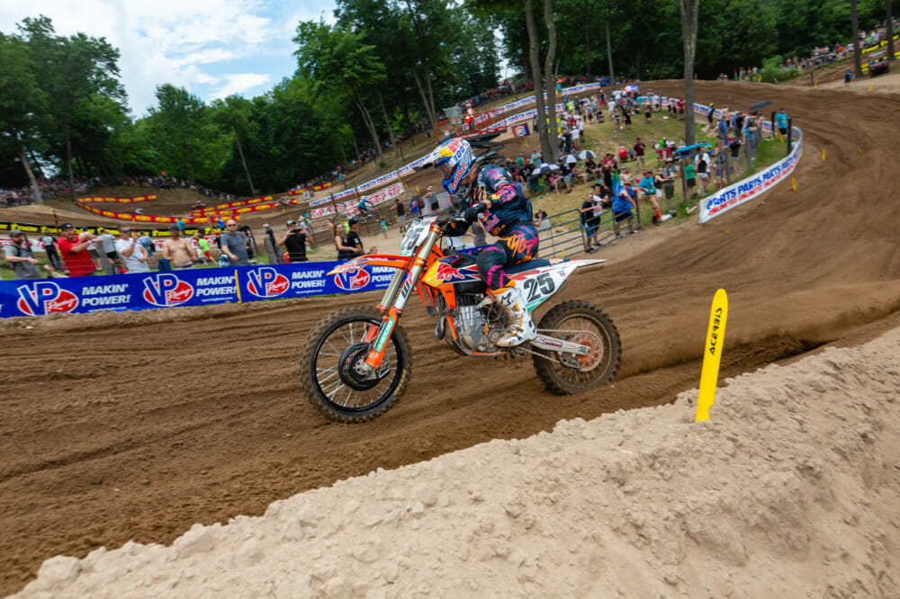 Red Bull KTM’s Marvin Musquin took down his second win in a row in the sand of Southwick, Massachusetts’ MX338, at the halfway point of the 2019 Lucas Oil/AMA Pro Motocross Championships. Musquin qualified first and then went 1-2 to take the overall win and move into second in the series points standings.