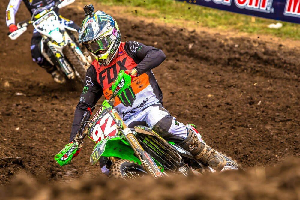 In the first 450cc moto, Tomac’s teammate Joey Savatgy grabbed the holeshot, while Tomac started around 10th. Honda’s Ken Roczen went by Savatgy immediately and set sail out front while Savatgy held off Red Bull KTM’s Cooper Webb (the winner of the previous round in Millville, Minnesota) and Marvin Musquin. But it wasn’t long before Tomac chased them down, and then went by all of them. Once into second, Tomac had about 11 minutes on the clock to make up 8.5 seconds on Roczen, but he didn’t need all of it. He caught Roczen with three laps left to go, then tried to dive under the Honda racer in the sharp left at the top of Horsepower Hill, only to fall down.