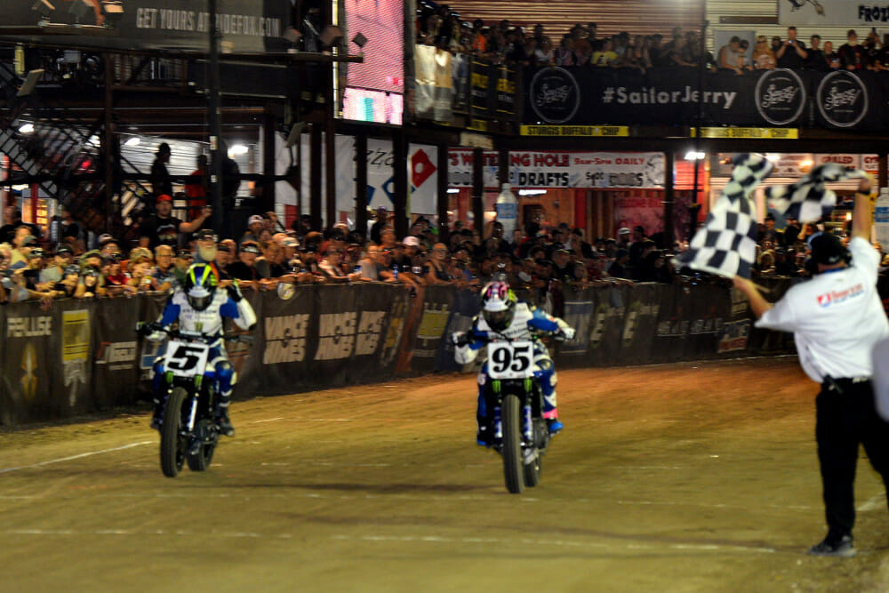 STURGIS, S.D. (August 4, 2019) – JD Beach (No. 95 Estenson Racing Yamaha MT-07 DT) blasted past teammate Jake Johnson (No. 5 Estenson Racing Yamaha MT-07 DT) just a few feet short of the checkered flag to steal away a most improbable victory in Sunday night’s wild American Flat Track premier class showdown at the Buffalo Chip TT presented by Indian Motorcycle in Sturgis, S.D.