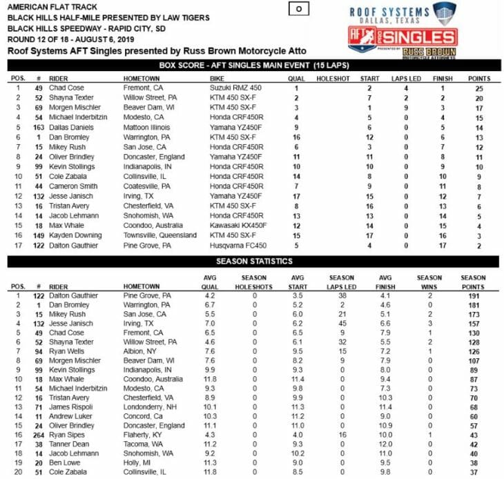 Weeks after claiming his first-career American Flat Track win in the AFT Production Twins class following a decade of trying, Chad Cose (No. 49 Parkinson Bros Racing/Rod Lake Suzuki RMZ 450) backed it up by scoring his first-ever Roof Systems AFT Singles presented by Russ Brown Motorcycle Attorneys victory in thrilling fashion.
