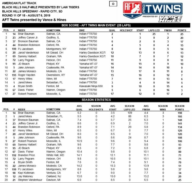 Two rounds ago, the AFT Twins presented by Vance & Hines title leader bounced back from a season’s worst 16th-place result with a blowout win in the New York Short Track. The factory Indian ace replicated that trick at Black Hills Speedway, following up a second 16th-place disappointment in Sunday’s Buffalo Chip TT with yet another convincing triumph.