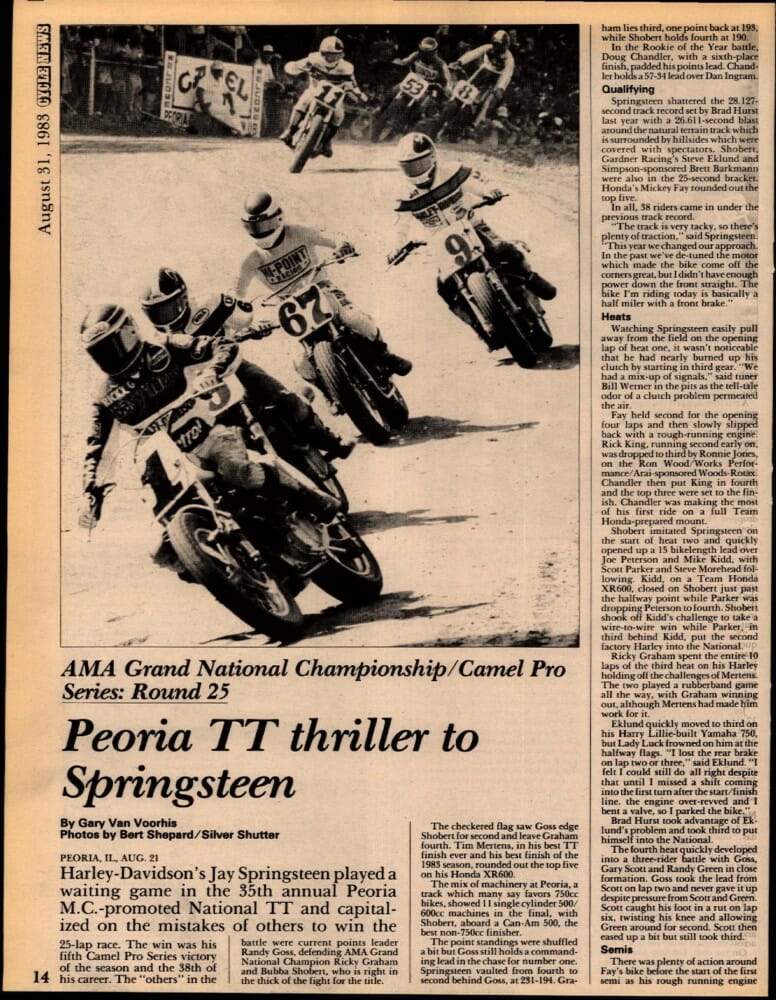 It was the 35th annual Peoria TT and change was in the air – 11 of the 17 starters in the ’83 race were racing single-cylinder machines. According to riders, the track was extremely tacky that day. So much so that Jay Springsteen set a new track record in timed qualifying on his factory Harley XR750, but he wasn’t the only one – a total of 38 riders came in under the old record set by Brad Hurst the year before. Even though the track was perfect for record-setting times, the fact that that many riders broke the record, shows just how competitive the field was.
