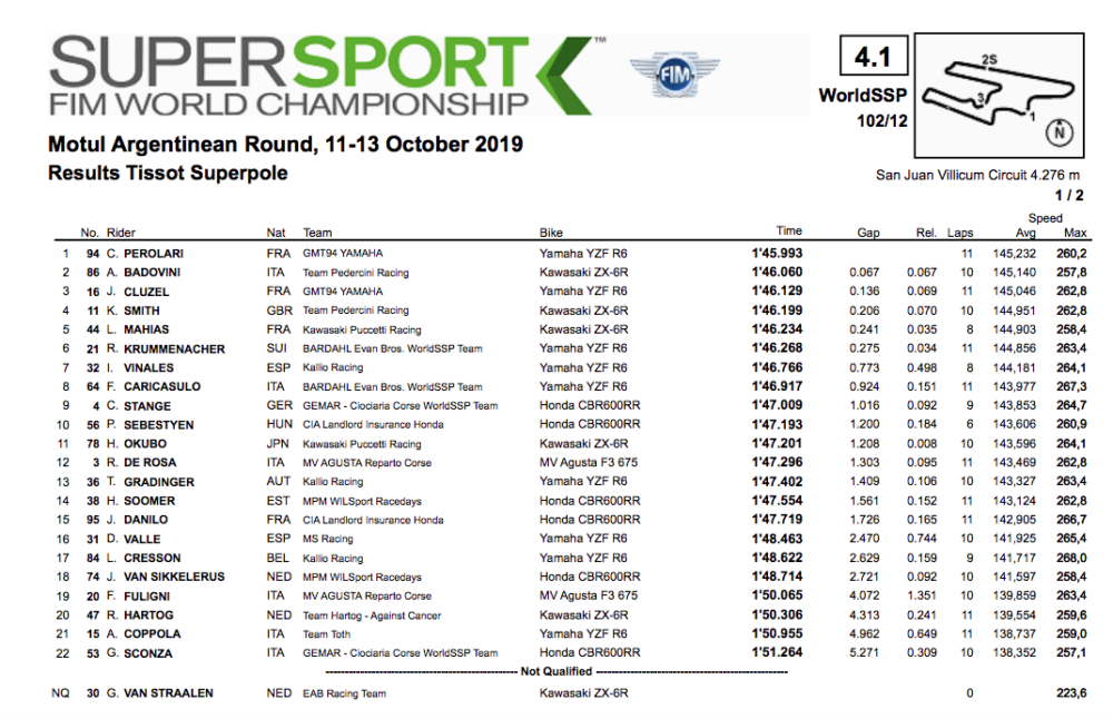 2019 Argentina World Superbike Results—WorldSSP Superpole