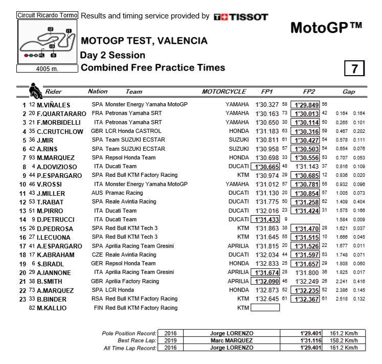 But it wasn’t all about the engine. Satellite Petronas team riders Fabio Quartararo and Franco Morbidelli were next fastest, to make it a Yamaha top three. They did it with the 2019 motor, relying only on their first experience with the carbon-fibre swing-arm, and other minor updates, including a new aerodynamic seat.