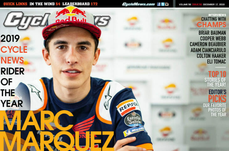 There have only been a handful of multi-time Cycle News Rider of the Year recipients since we resurrected our CN Rider of the Year tradition at the end of 1991. We gave it to three-time world champion Wayne Rainey, and our pick for rider of the year has routinely been featured on the front page of CN on our year-end issue ever since, and only a few ROYs have been pictured there more than once. Ricky Carmichael quickly comes to mind, and he did it three times, two of them were back to back. Marc Marquez now joins the shortlist of two-time CN ROY winners. We also gave Marquez the recognition in 2013.