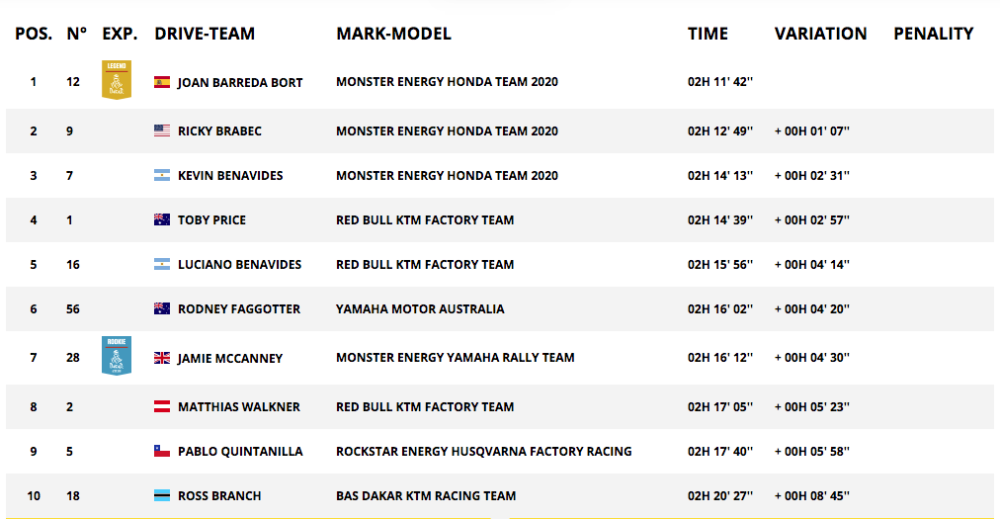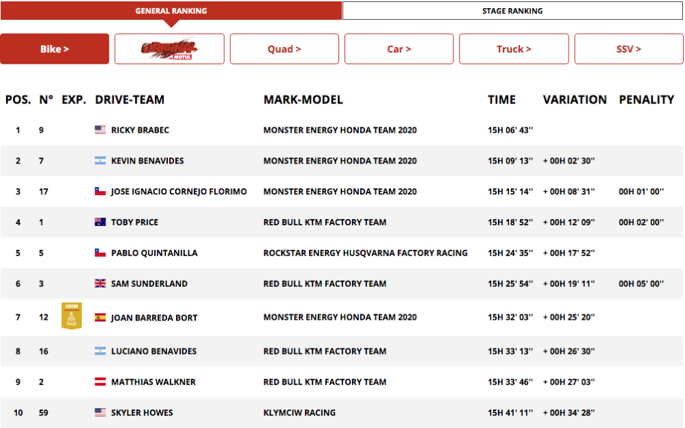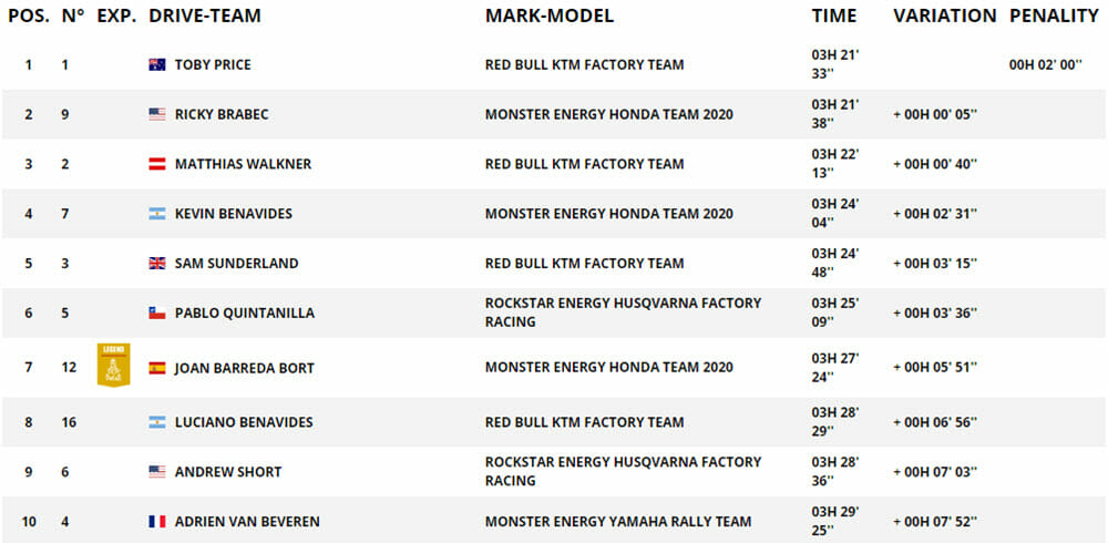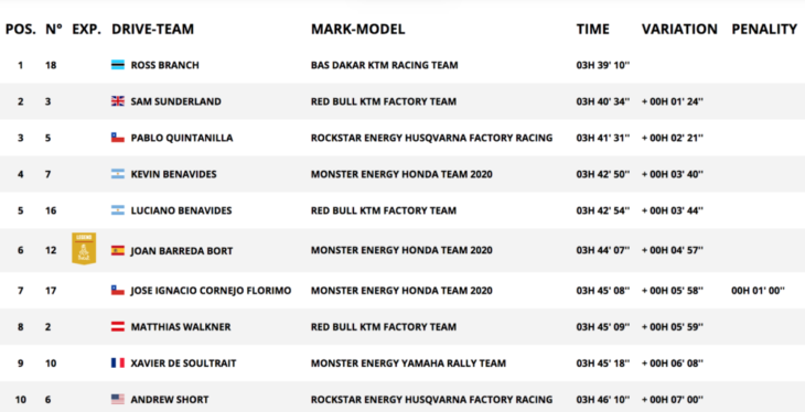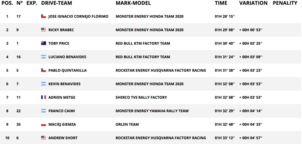 Brabec initially finished the stage 9:39s clear of Chilean teammate Jose Ignacio Cornejo, however, this was later revised to 5:56s, leaving the American with a lead of 4:43 seconds from his third teammate, Argentinian Kevin Benevides with Walkner third, 6:02s behind Brabec.