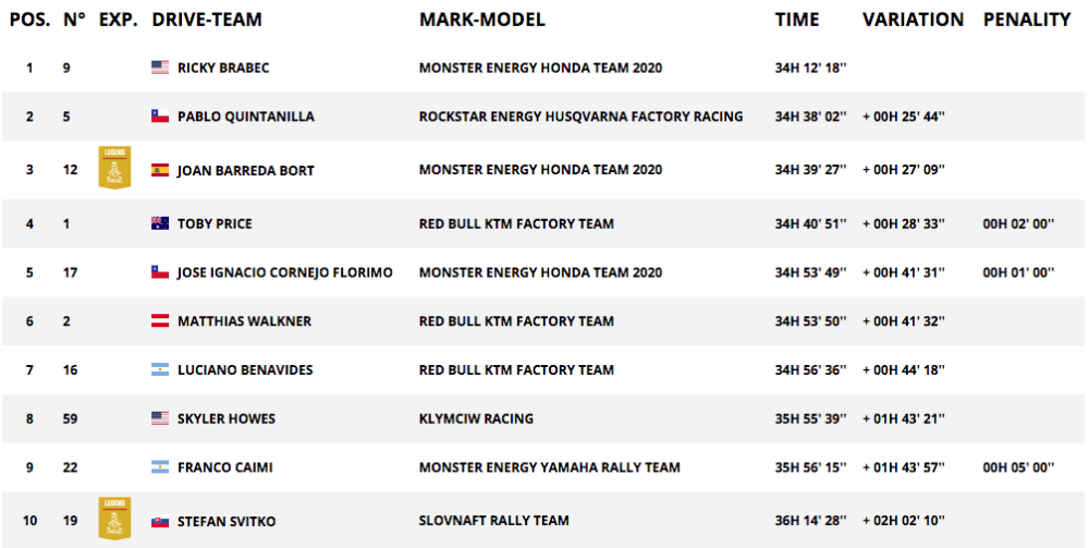 2020 Dakar Rally Motorcycle Results—Overall (Stage 10)