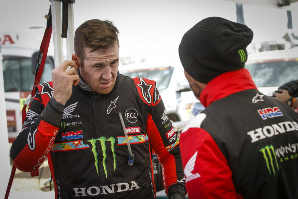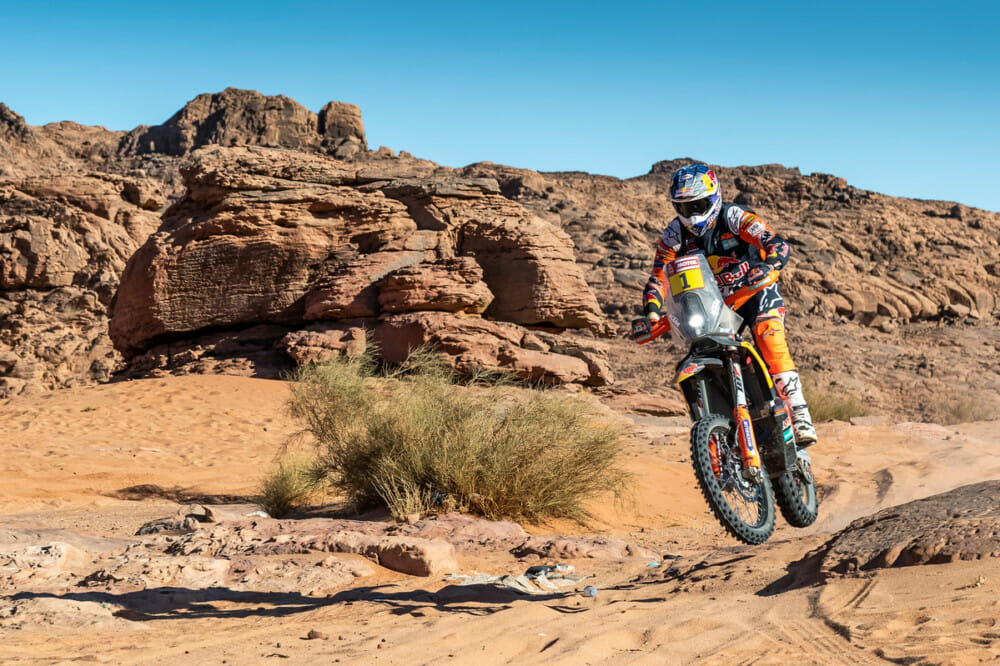 “Today was actually really fun,” Brabec said. “The train was really epic. There were a lot of rocks, lots of stones, a lot of sand, and a lot of tricky navigation. It was really fast, which is what I really prefer. I had a good starting position today, where I started a little bit back in 12th position, didn’t have too much dust, and I passed the first rider at kilometer 20. I knew today I could push. It was difficult. Every note that I thought was difficult I slowed down and took my time. I was pushing all day. We had three short specials. I was riding really well and I felt really good today. The roadbook is really good. The information here is really, really nice here. Tomorrow will be tricky. It’s always difficult opening because you have all the riders pushing behind you.”