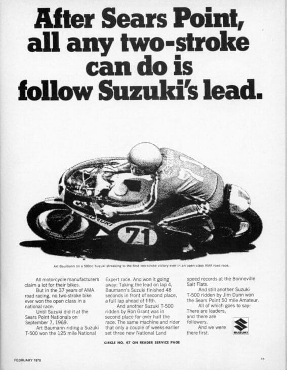 It’s been a long-held notion by motorcycle-racing pundits that Suzuki was the first of the Japanese motorcycle manufacturers to win an AMA Grand National, with Art Baumann’s road race national victory at Sears Point in 1969 aboard a Suzuki TR500. But is that really true? Well, as they say on Facebook, it’s complicated.