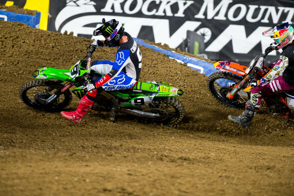 In the main event, Webb started just behind Cianciarulo and briefly passed the Kawasaki rider on the opening lap, only for Cianciarulo to take it right back. The pair led Monster Energy Yamaha’s Aaron Plessinger for the first six laps, only for Plessinger to go down and hand the third spot to Rocky Mountain ATV/MC KTM’s Blake Baggett. But with Plessinger going down, the gap back to Baggett in third was sizeable, and Webb had about 15 minutes left in the race to try and figure out where to make up time on Cianciarulo, and then where to make the pass.