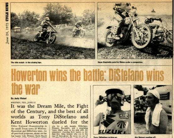 Stephen Schneider remembers the epic 1975 AMA 250cc National. “Tony DiStefano and Kent Howerton in the deciding round of the 250 championship. Kent with home state advantage and a mathematical chance to win. Tony D broke a rear shock or shock mount in the second moto, yet managed to finish high enough to seal the deal. Freestone-type summer weather in the manly days of 40-minute, plus two lap motos.”