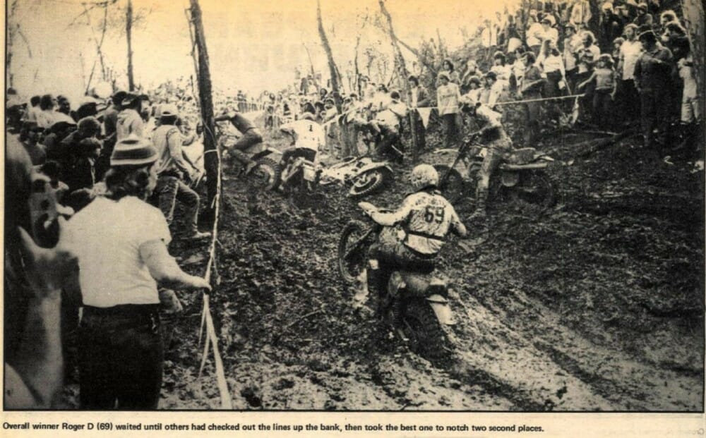 There was no national at the track in ’74, but it hosted what was an even bigger event at that time, in the form of a Trans-Am that fall. It was MX legend Roger DeCoster taking the victory on his factory Suzuki in an absolute mud bath. The area endured 15 straight days of rain leading up to race day. Promotor Harvey Evans even damned a creek that ran through the property in an effort to divert water away from the track. It was so bad Evans considered canceling, but another Trans-Am near St. Louis had been canceled earlier and Evans knew it would be terrible for the series to have two cancelations in a row, so he made the best out of a bad situation.
