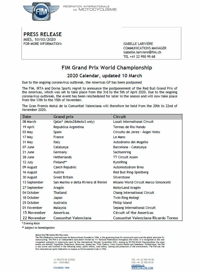 Since this was originally posted on March 10, 2020, the FIM, IRTA and Dorna have made further updates to the schedule. Please see this updated article: https://www.cyclenews.com/2020/03/article/updated-motogp-and-worldsbk-schedules/