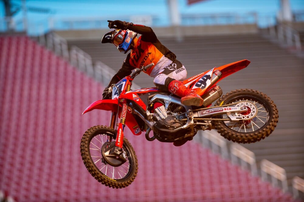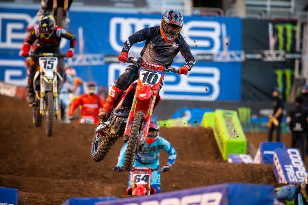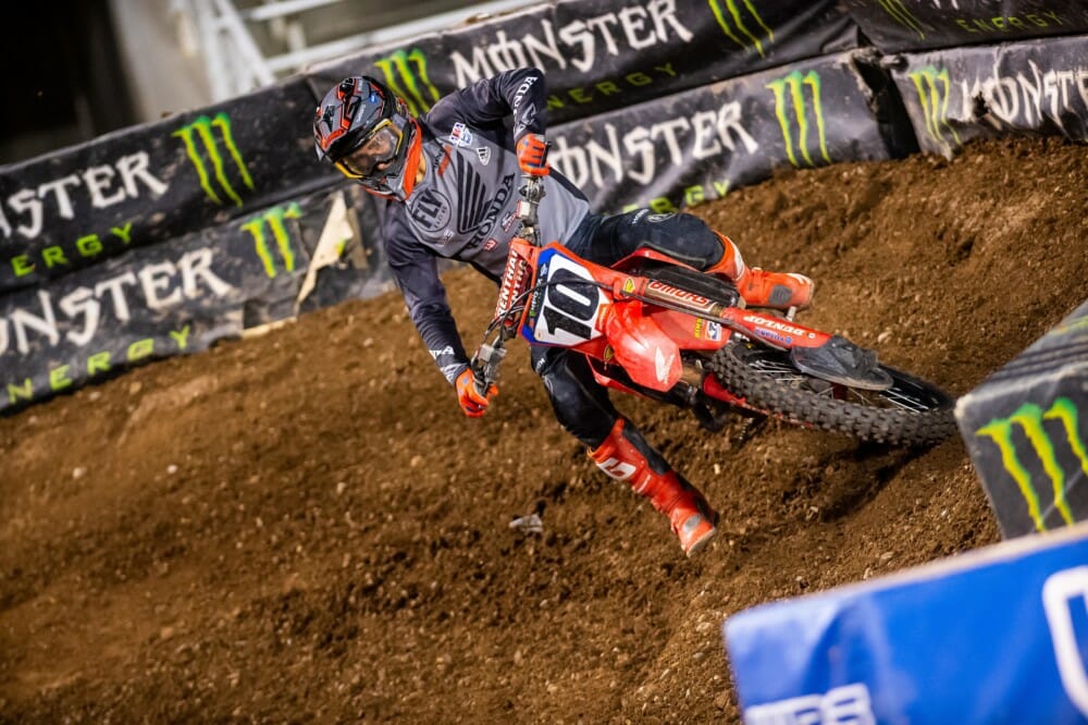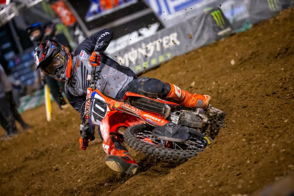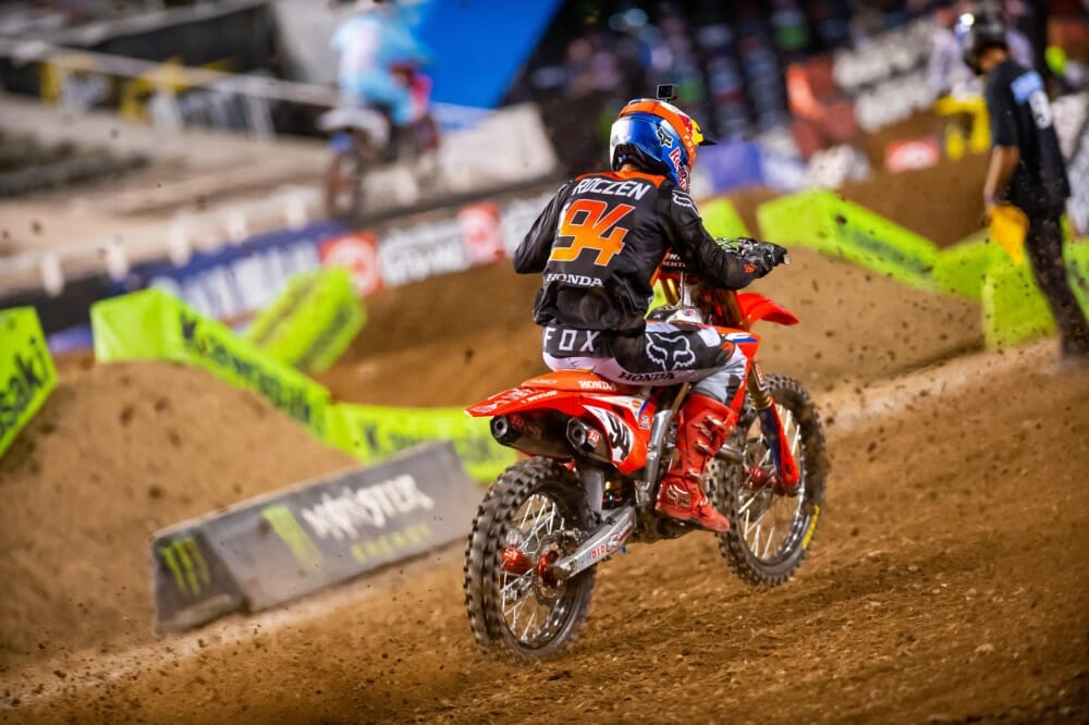 The first AMA Supercross ever held on a Wednesday–and the second race in the space of just three days, although both took place at Salt Lake City’s Rice-Eccles Stadium–saw Team Honda HRC’s Ken Roczen launch a strong recovery from a so-so start, only to end up fifth at the finish. Starting from the far-inside gate, the German was balked in the right-hand first turn and finished lap one in eighth, but he went on a tear that carried him to fourth in the space of just five laps. As the track became slipperier, he lost momentum and ended up riding to a safe top-five result.