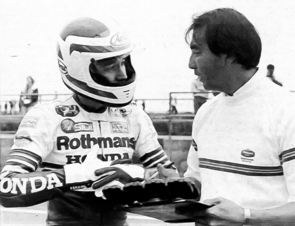 “And we were sitting around afterwards, Mr. Oguma—who was the HRC manager—Erv [Kanemoto] and myself, and we just started talking about the Championship. This was about halfway through the ’84 season, and we’d had a wheel come apart on me in South Africa, and then had this [plug cap] happen to me at South Africa. We had gotten knocked out of a couple races. Erv and I had already been talking about it, and I brought it up that I thought it would be interesting if we decided to go for two championships to make up for the championship that we might not win in ’84. We just kind of batted it around.”