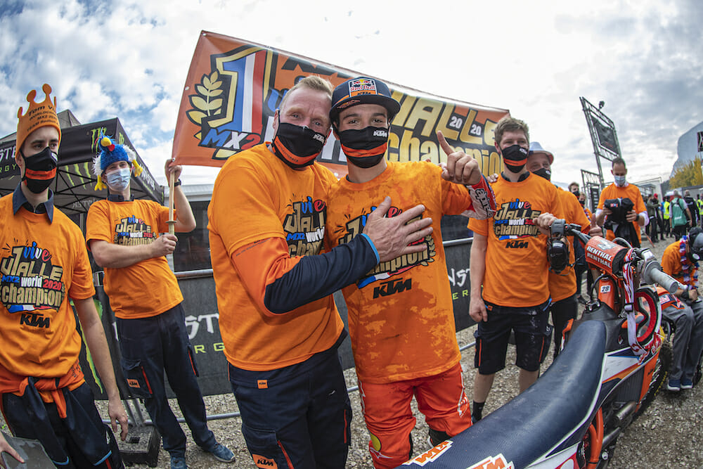 “It feels just unbelievable,” said Gajser of winning the MXGP title. “Like I said many times, winning one is incredible but now four is just…speechless. I’m really happy. It was a weird season, but anyway in the end everything came together, and we won another title. In the first race, I was already struggling with the clutch and was riding without the clutch the whole race, finishing second. Then in the second race, I had a nice battle with Romain [Febvre] who was really pushing and I’m super happy to win the title and the overall on the same day”.