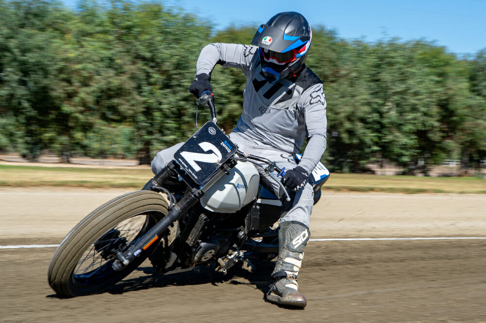 “We’re taking a lot in in a short amount of time and our bodies and minds can only handle so much, and with flat track you’ve got to be 100 percent when you’re out there doing it,” Lewis says. “You can’t half slide a motorcycle. Either you’re sliding or you’re stopping and you’re starting the process all over again. So, it’s about being on top of your game. I really emphasize that with my program. The slide school is typically three and a half hours. But we do offer a little bit longer programs too, to kind of space it out a little bit and make sure the body is good and ready to go and be 100 percent when you’re trying to slide a motorcycle.”