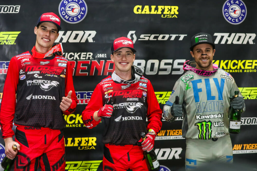 Mike Alessi, on the Babbitt’s Kawasaki, grabbed the holeshot in the 250 Pro main Friday night. He would hold the lead for a few laps, but both Phoenix Racing Team Honda boys—Peters and Cullin Park—were hot on his tail, and they would ultimately go on to pass him. Peters took over the lead in lap four, and Park started to bring the heat on Alessi on lap six. Park eventually got around Alessi, making the final finishing order Peters, Park and Alessi. Kyle Bitterman (Kawasaki) was a close fourth, while Isaac Teasdale rounded out the top five some 10 seconds back.