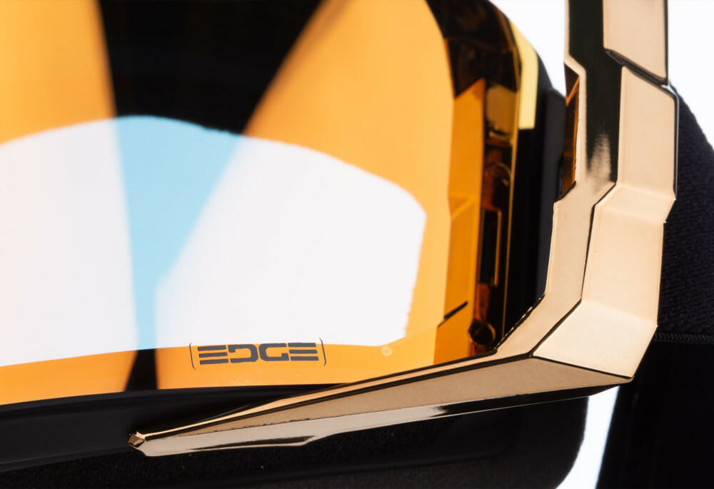 To achieve maximum field of view, the Edge uses a frameless design where low profile magnets guide the lens into place while a slide lock secures it–this makes the lens area as broad as possible while fitting inside a helmet. Further, the injection-molded lens is almost perfectly optically correct, avoiding distortions found in other lens types. Anti-fog coating, perimeter frame vents and the large internal air volume all combat fogging, which is great for extreme enduro riders and warm, humid conditions.