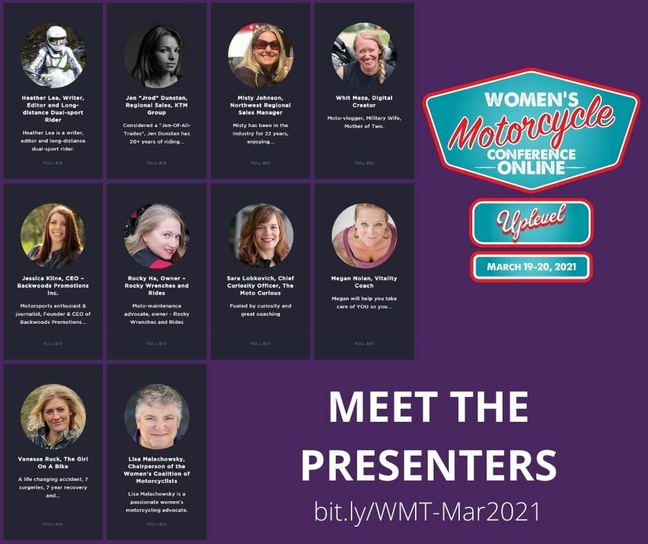 “I am excited to welcome the women riders and the men that support them to the third edition of our Women’s Motorcycle Conference Online,” said Clickenger. “I chose Uplevel as the theme this spring to focus on up-leveling our skills, enhancing our riding finesse and improving our overall mechanical knowledge about motorcycles. Put simply, this conference by women and for women, and is aimed at empowering women riders, connecting them with the vast network of worldwide women riders and take them up a notch as a motorcycle rider.