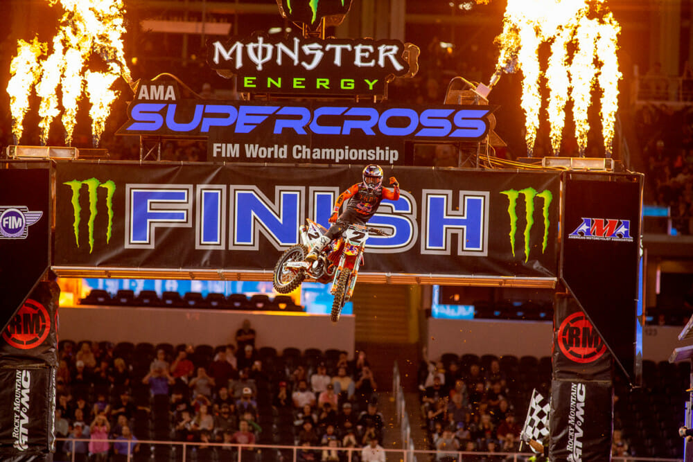 2021 Arlington 1 Supercross Rnd 10 Results: Cooper Webb (Red Bull KTM) made a statement victory tonight in Arlington, Texas, and, as a result, took over the points lead after round 10 of the Monster Energy AMA Supercross Championship. A wire-to-wire win boosts him seven points ahead of championship rival Ken Roczen with seven races left in the championship.
