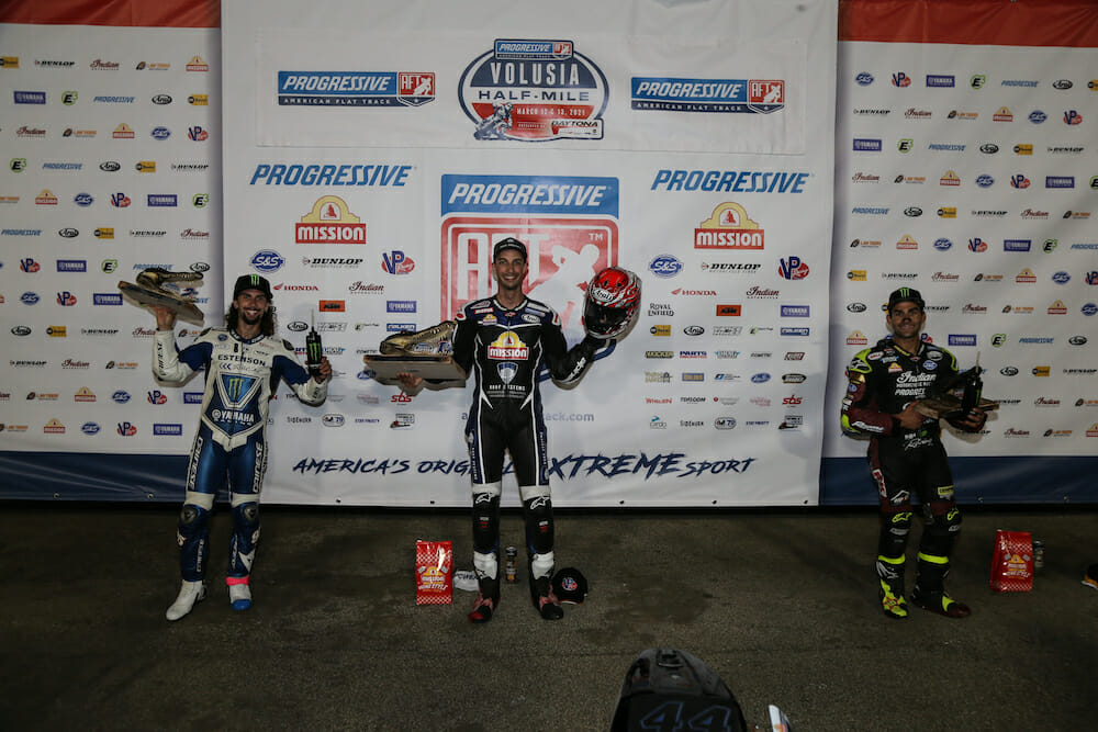 2021 Volusia Half-Mile 1 Results: While most of the preseason hype was directed elsewhere, it was Brandon Robinson (No. 44 Mission Roof Systems Indian FTR750) who delivered the opening salvo of the 2021 Progressive American Flat Track season with a victorious performance in Friday evening’s Volusia Half-Mile I presented by Daytona Dodge at Volusia Speedway Park in Barberville, Florida.