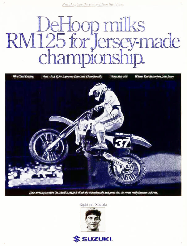 DeHoop is a veteran motocrosser from Michigan who competed in the outdoor National Motocross and Supercross circuits from the mid-1980s to the late 1990s. His last professional race was in 2001. He won the 125cc East Supercross Championship riding for Suzuki in 1988 (which was his only year on a factory team). He later rode for Tuff Racing and Honda of Troy.