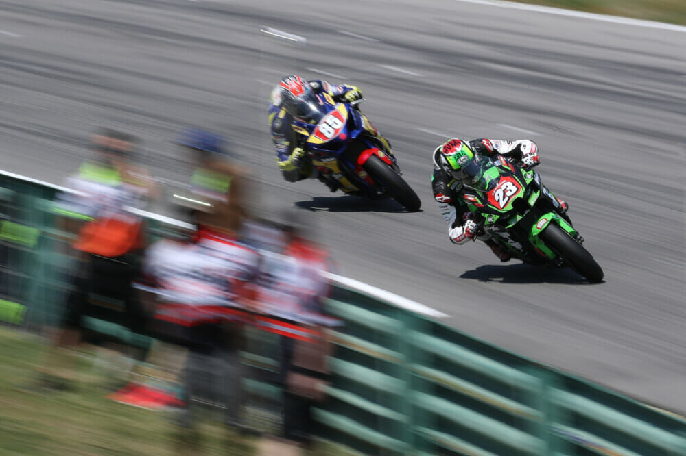 Wyman nipped second-place finisher Ben Gloddy, who was aboard a Landers Racing Kawasaki, by just .049 of a second. Gloddy won Saturday’s race one and appeared to be headed for the double win until Wyman swooped in and grabbed the victory. Also among the lead group was Veloce Racing Kawasaki’s Maxwell Toth, the California rider taking third just .113 of a second behind Gloddy.