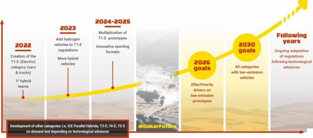 In the continuity of the adjustments made to balance the playing field with navigation, the electronic roadbook will be generalized to all crews in the car, SSV and truck categories. A version for motorbikes and quads will also be available for elite riders. Above all, the 2022 edition will mark the starting point of the plan to host a field of cars powered solely by alternative energies by 2030. The disappearance of combustion engines will take place according to a progressive timetable subject to technological developments. Initially, this will involve the opening of a T1-E category for low-carbon emission prototypes. Constructors are currently developing these cars to make them as competitive as possible, starting with Audi, which plans to take on the challenge beginning in 2022. Electric powered cars will soon take on the Empty Quarter.
