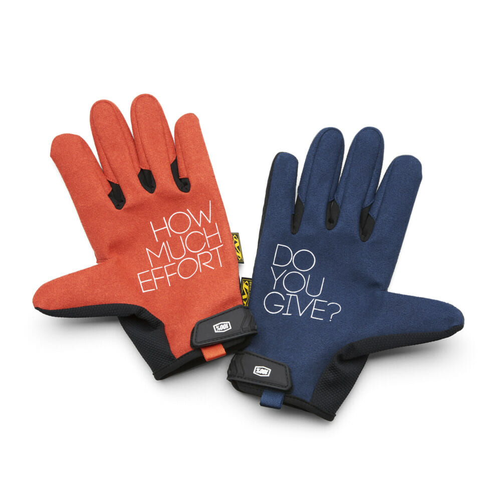 The collaboration combines the best garage gloves with the featured 100% extended logo and signature colors. A special print on the palm of the gloves is taken from the original 100% tagline, “How Much Effort Do You Give?” 100% continues to inspire a whole new generation of athletes asking this same question.