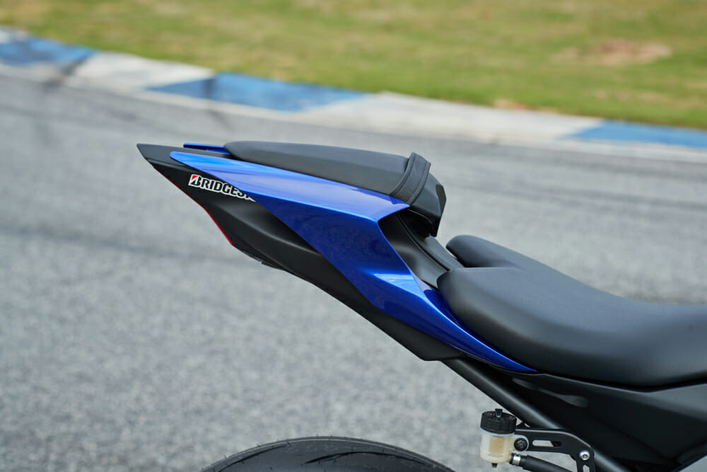 Compared to the R6, the rider triangle is a little more relaxed with the handlebars a touch higher up and closer to you. The footpegs are basically in the same position, and the angle of the seat is similar, too.