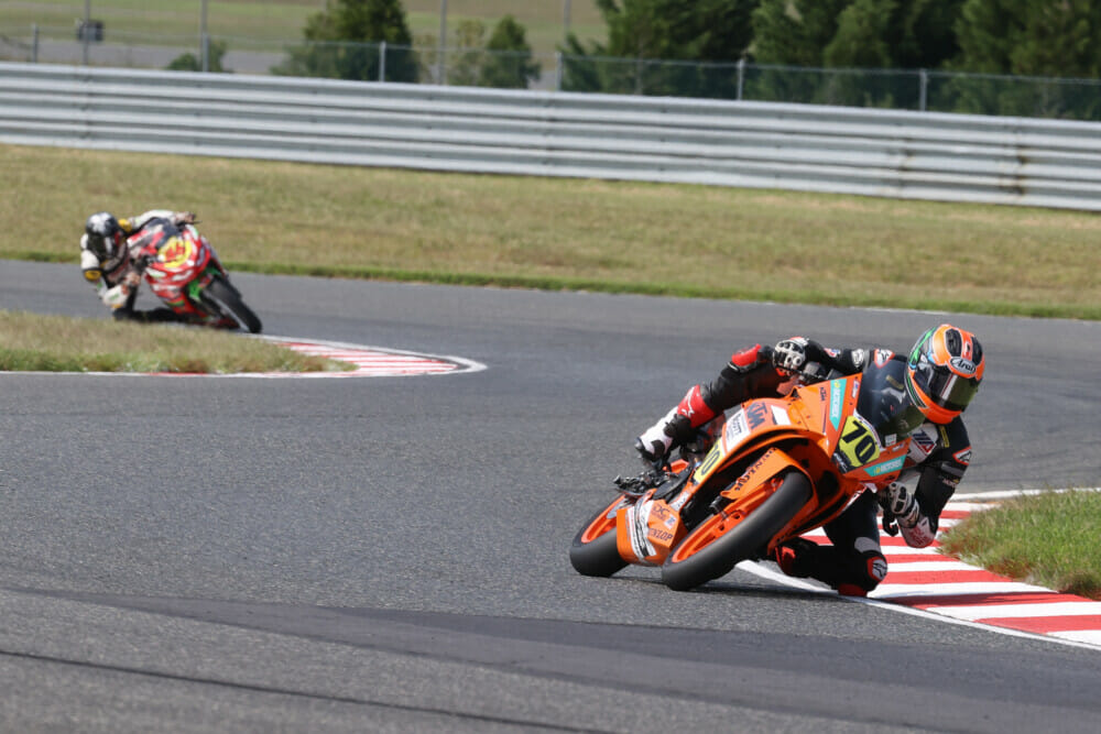 In SportbikeTrackGear.com Junior Cup race one, Scott Powersports KTM rider Tyler Scott and Landers Racing Kawasaki’s Ben Gloddy were expected to continue their season-long fight for the championship, but a fractured wrist suffered by Gloddy a couple of weeks ago prevented Gloddy from finishing higher than fourth, and he was more than eight-and-a-half seconds behind race-winner Scott when the 13-lap event concluded.