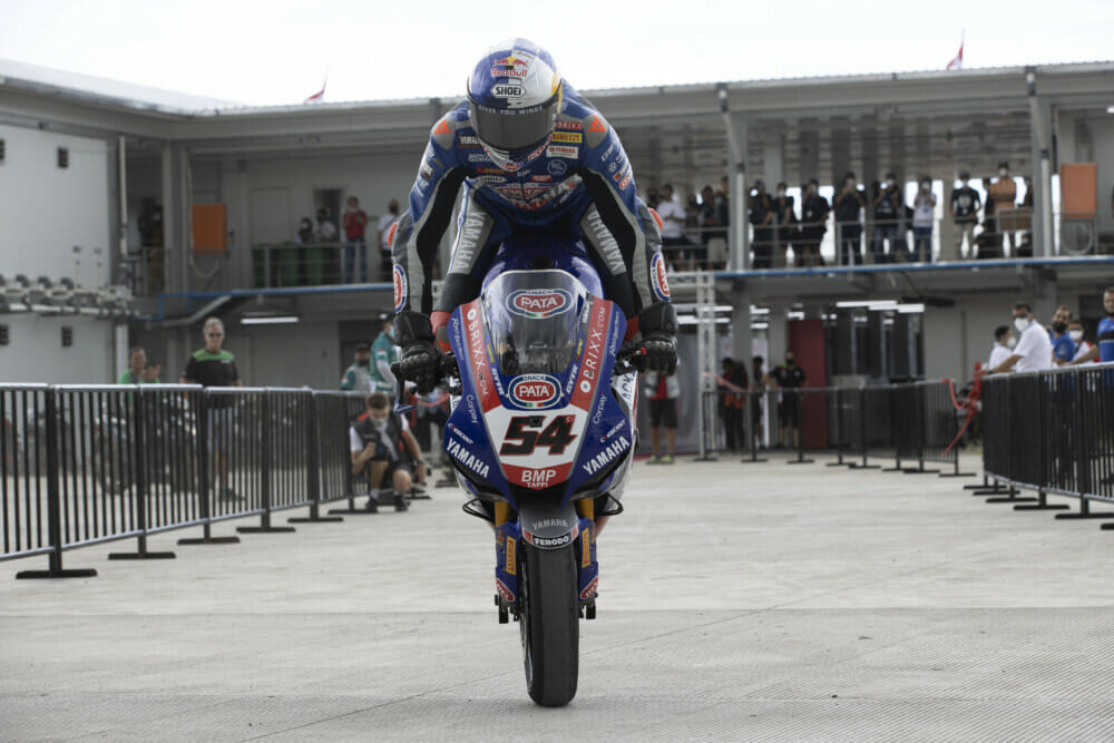 In gold leathers, helmet and bike after a quick change out on track Razgatlioglu did impressive rolling burnouts down pitlane as he came in to the pits to be greeted by his ecstatic team and Yamaha staff.