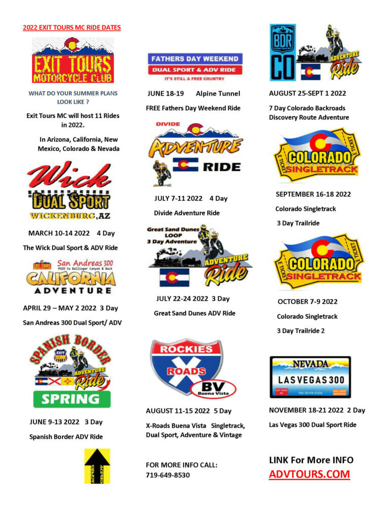 Exit Tours Motorcycle Club of Salida, Colorado will host 11 Dirt Bike rides in 2022.