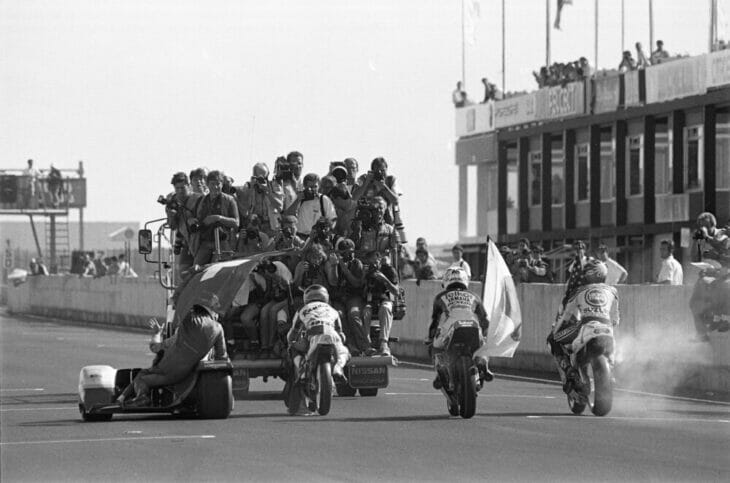 In this week’s Throwback we go back 29 years to the completion of the 1993 Motorcycle Grand Prix World Championships. The four class champions came out for a final ride around Jarama for fans who stuck around, and for photographers to capture a unique image of the quintet of freshly-crowned champs riding side by side. From left to right in this shot are 1993 Sidecar World Champs Rolf Biland and Kurt Waltisperg of Switzerland aboard their LCR-Krauser, then 125cc GP Champ Dirk Raudies of Germany on his Europa Raudies-Honda, 250cc GP Champ Tetsuya Harada of Japan on his Telkor Valesi-Yamaha and 500cc GP Champ Kevin Schwantz of the USA on his Team Lucky Strike Suzuki. It appears that there are at least 20 photographers crammed onto the back of the truck trying to take shots.