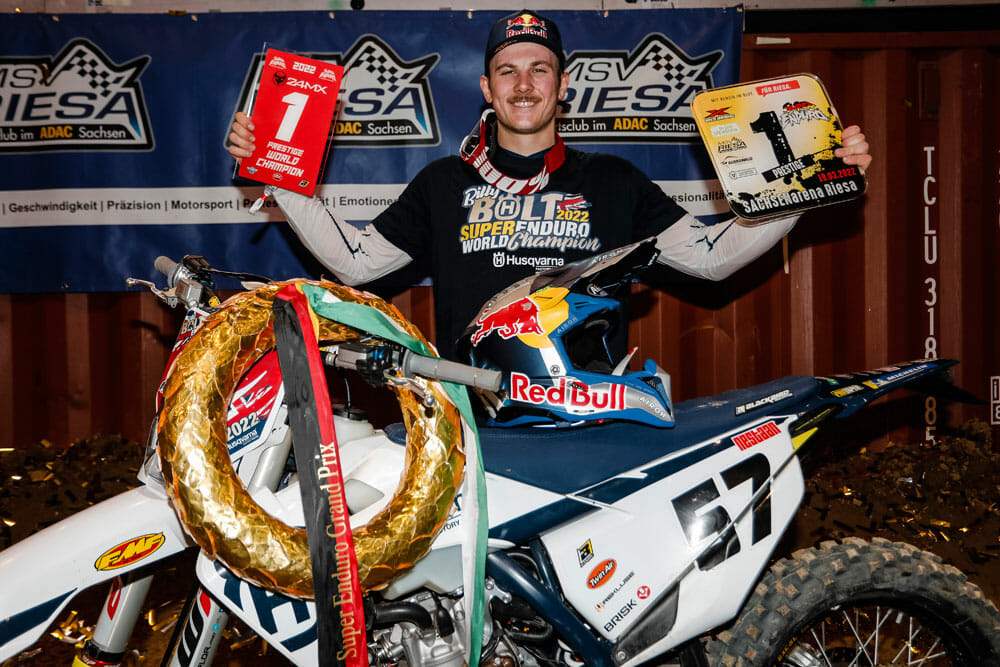 Bolt, aboard the Husqvarna FE 350 four-stroke, thoroughly dominated the 2022 title race, winning 14 out of the total 15 heat races over the course of the championship. In Germany, Bolt won all six (three each night) main events, officially clinching the championship on Saturday.