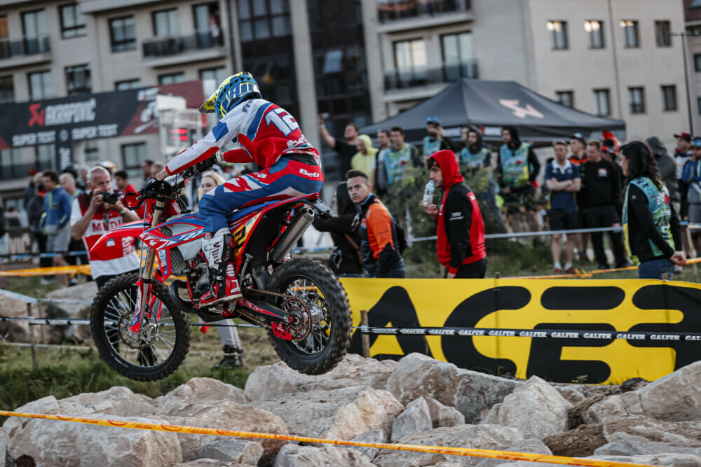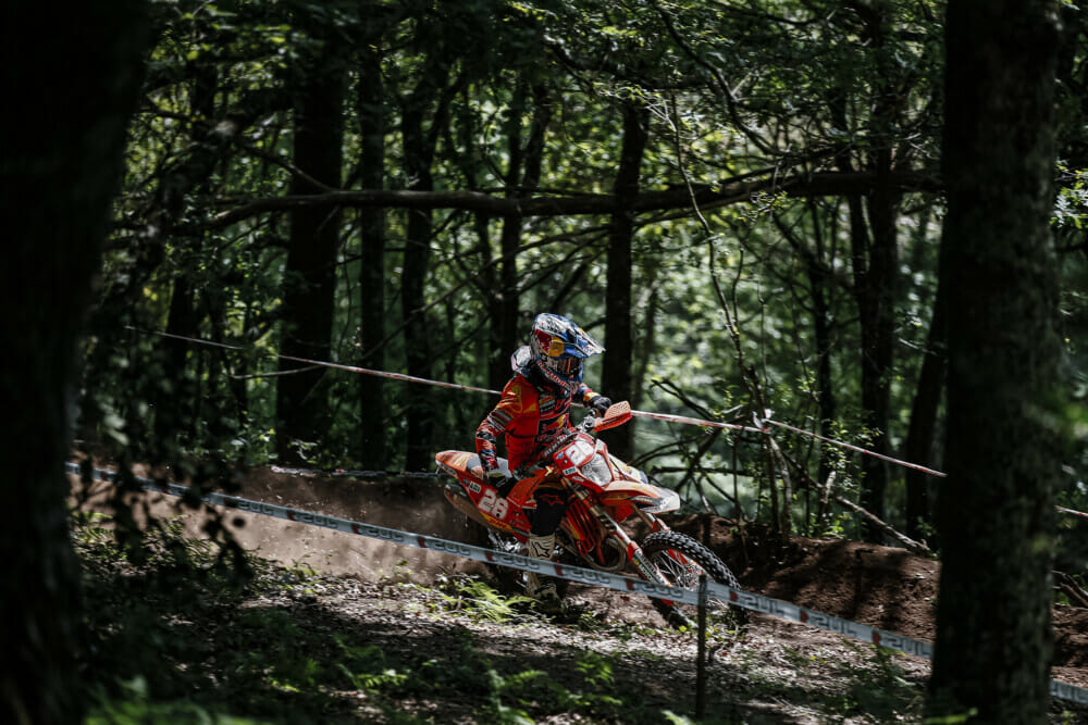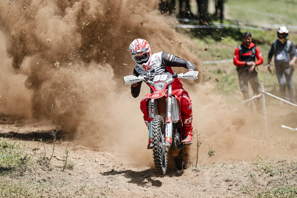 The opening day (Saturday) boiled down to a three-way battle involving the Italian, Verona, Britain’s Steve Holcombe and Australia’s Will Ruprecht. And Spaniard Josep Garcia was always lurking, as well. Holcombe threw the first punch in the opening test, but positions constantly changed throughout the day. Going into the final test of the day, just two seconds separated Holcombe, Ruprecht and Verona for the win. Verona, on the factory GasGas, emerged as the EnduroGP overall victor for the day, ahead of Beta’s Holcombe and TM’s Ruprecht.