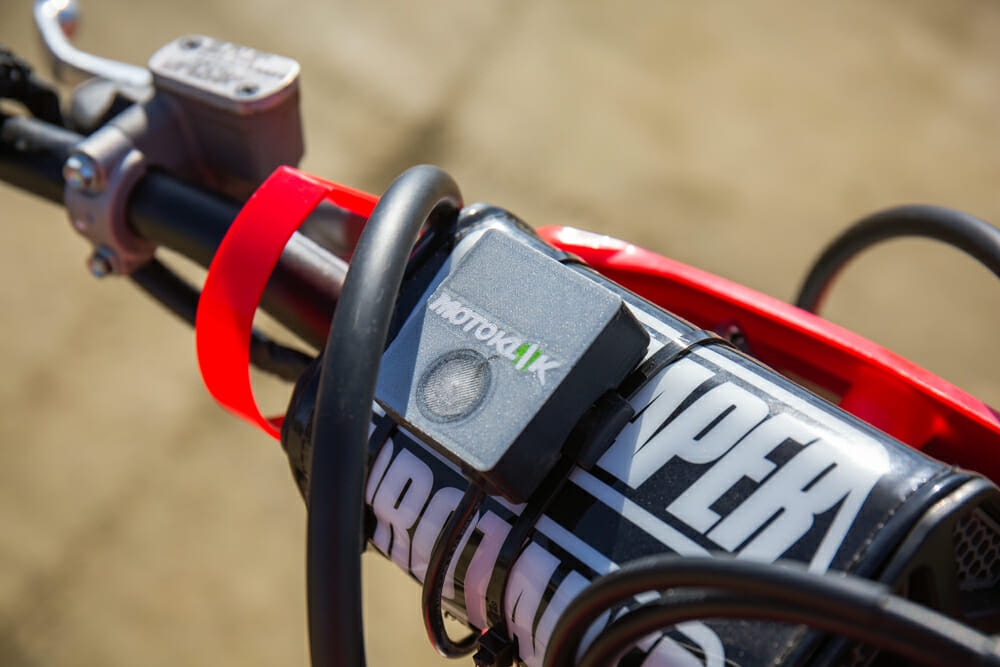 The sensor for the front forks looks like a set of black upper fork guards and the rear shock sensor tucks up nicely behind the frame and rear-brake cylinder. It’s a universal fit for several late-model four-stroke motocross motorcycles from GasGas, Honda, Husqvarna, Kawasaki, KTM and Yamaha. According to the company’s website, systems for KTM enduro models will be available soon. For our CRF450R, the Motoklik system mounted up fairly easily to pre-existing holes on the bike. You do have to tap into the bike’s battery to power the system but instructional videos from Motoklik aid in this process.