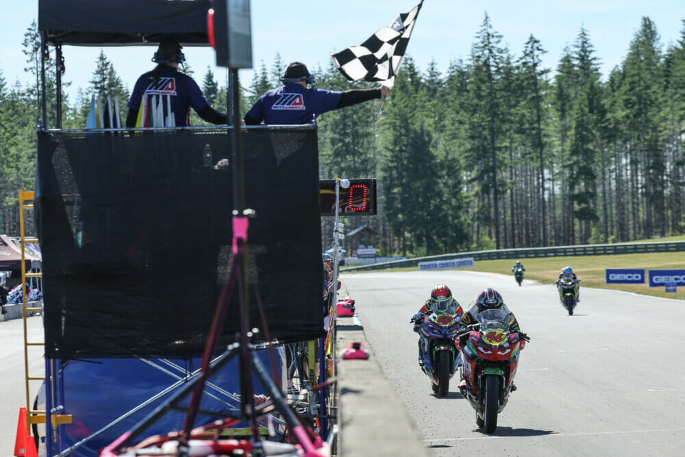 Oregon-based rider Andy DiBrino showed well at his home track. Aboard his Precision Iron Works/DiBrino Racing Kawasaki, DiBrino started second and maintained his runner-up position all the way to the checkers. Third place went to Disrupt Racing Suzuki rider Hayden Gillim.