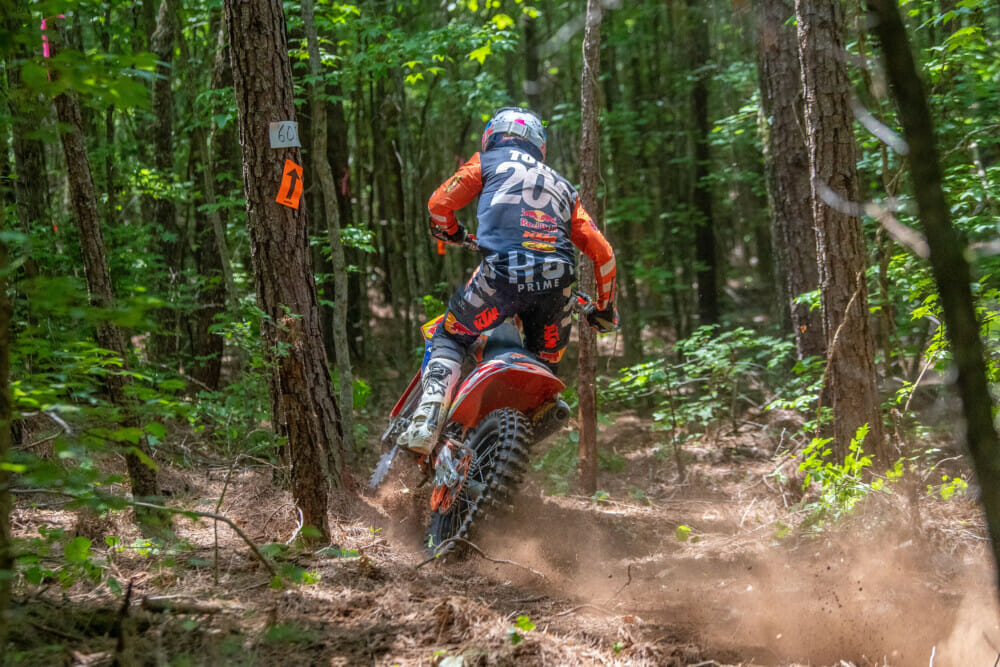 High temperatures and humidity made for a tough day as over 660 riders took to the dry and root-strewn course. Grant set the tone by winning the opening test of the day, but his mental lapse in test two was a major unforced error that cost him 30 seconds right off the bat.